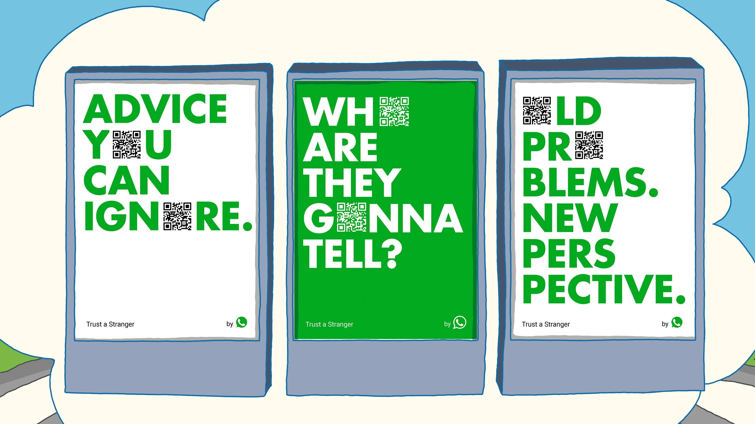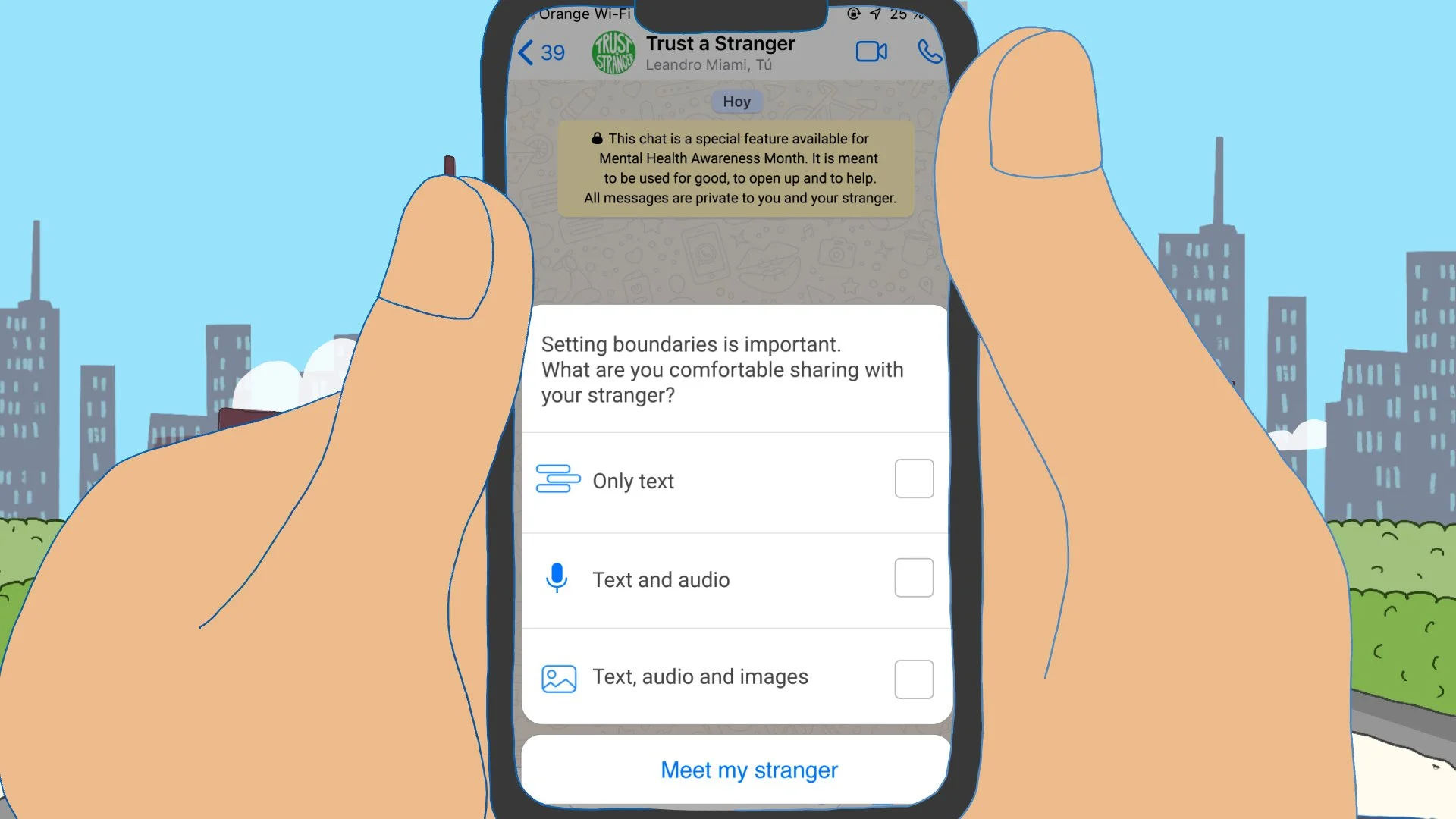 Whatsapp wanted to do something for mental health awareness month so young people would consider opening up through the app. We conceived a way to open up without any fears, not even of being judged. Through a stranger.